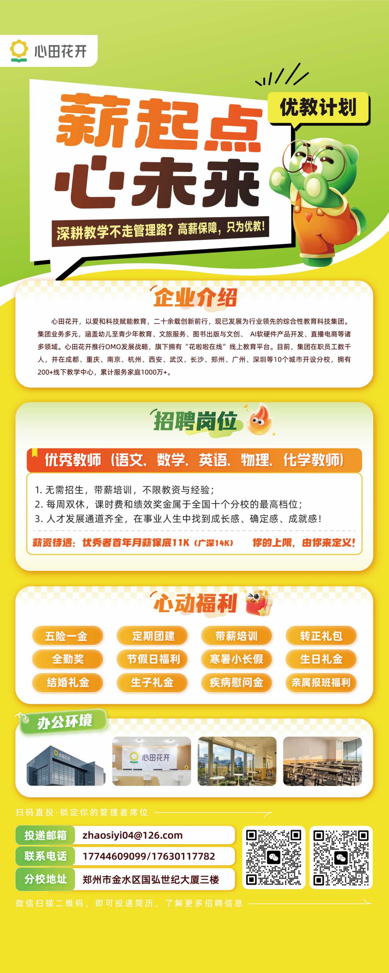 1.招聘岗位(1-9年级) 语文教师、英语教师【地址:郑州】 不限教资、不限专业