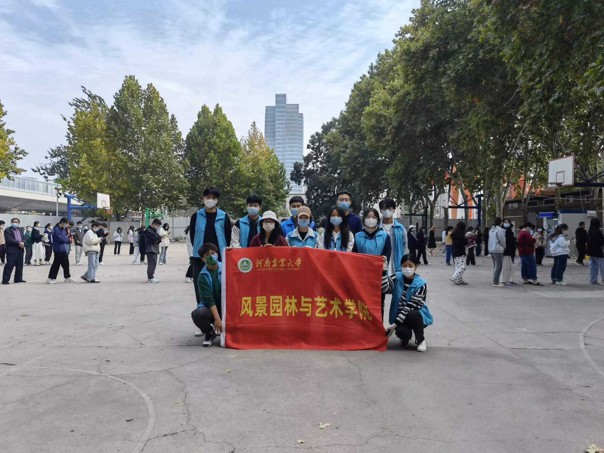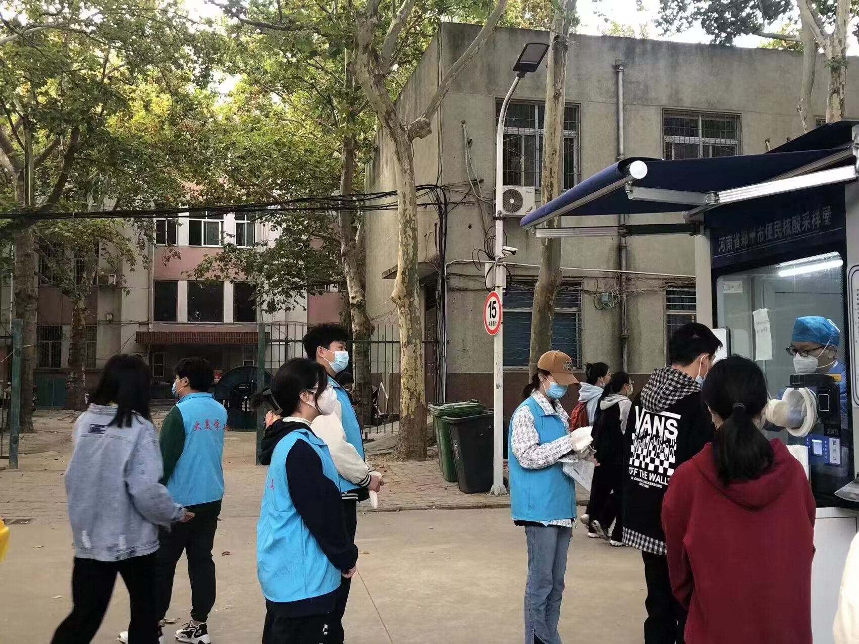 师生志愿者于10月25日再次前往文化路校区核酸检测采样点开展志愿服务活动与校园巡逻工作。院党委副书记赵九阳,院团委老师芦嘉俊深入核酸检测现场,亲切慰问了志愿者们。