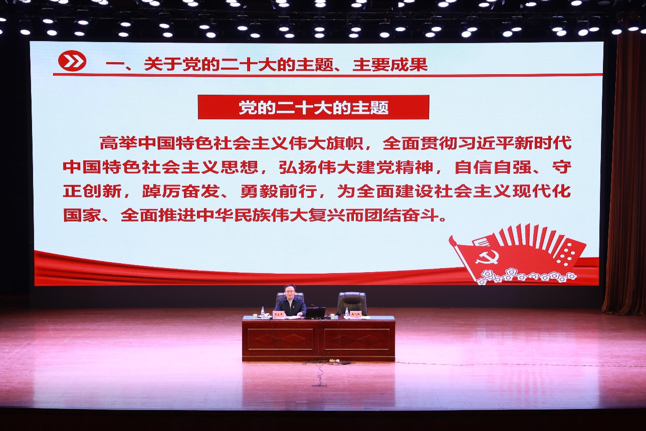 院党委书记侯永华以“深入学习宣传贯彻党的二十大精神”为主题,围绕“党的二十大的主题和主要成果”、“过去5年的工作和新时代10年的伟大变革”、“中国式现代化”、“全面建设社会主义现代化国家的目标任务”、“坚持党的全面领导和全面从严治党”、“应对风险挑战”、“总书记对青年学生的寄语”等7个方面,深入浅出地向同学们阐述了党的二十大报告的精髓要义,带领同学们进一步了解国际国内形势,深刻感悟新时代党和国家的历史性伟大成就。他勉励青年学生要坚定不移听党话、跟党走,树立远大志向、掌握过硬本领、促进全面成长,以守正创新、踔厉奋发的姿态勇毅前行,让青春在全面建设社会主义现代化国家的火热实践中绽放绚丽之花。