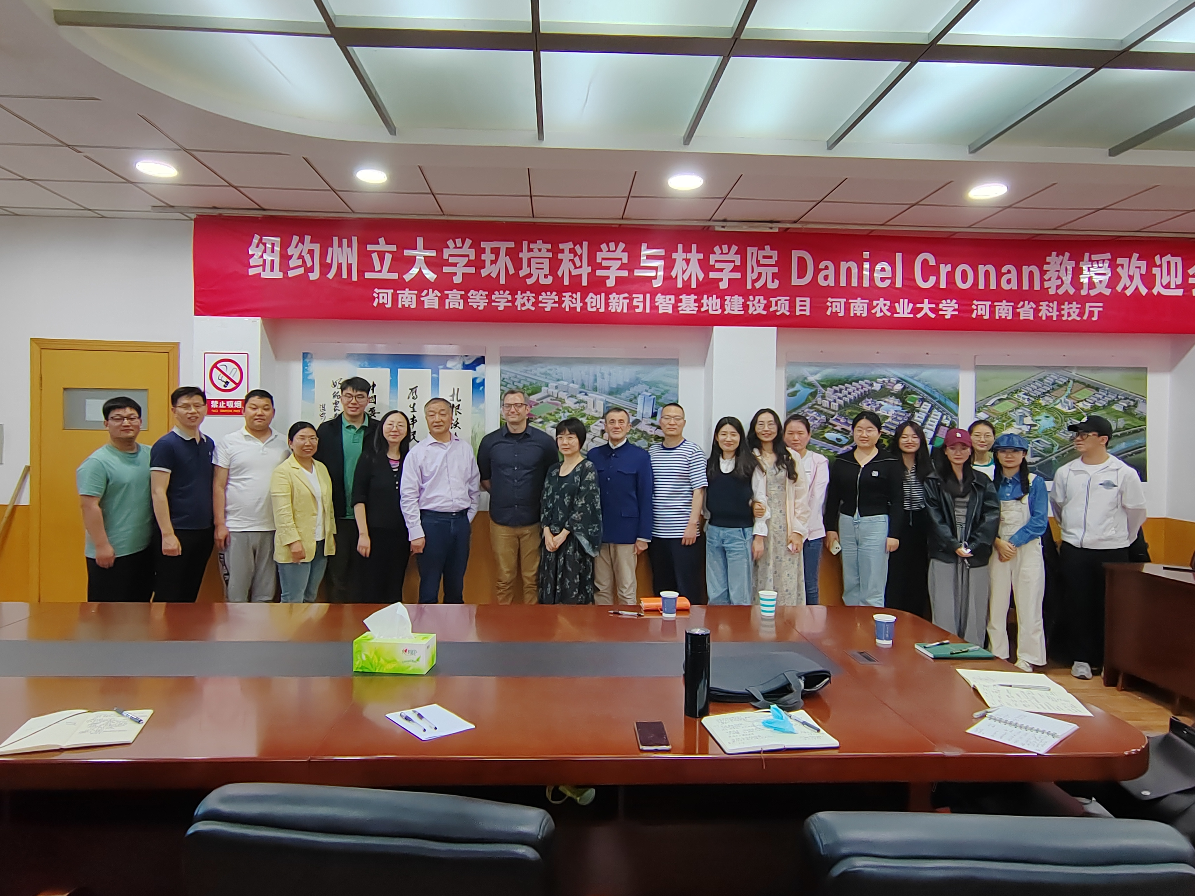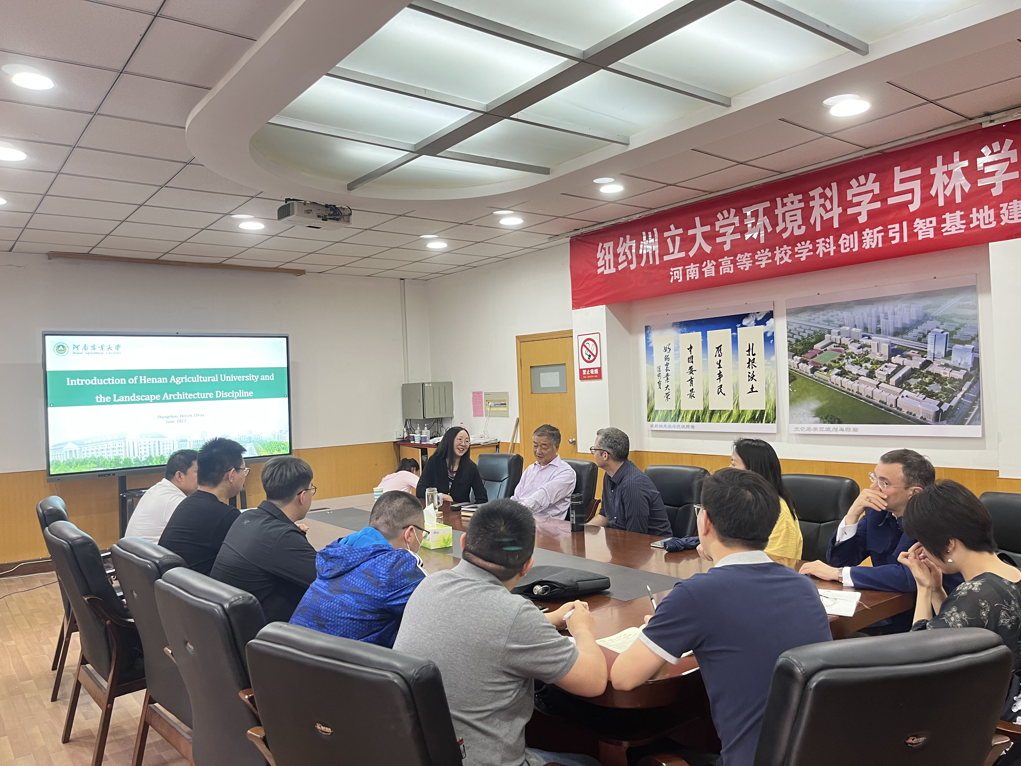 田国行教授首先就三位外国专家应邀到校进行学术交流表示衷心感谢和热烈欢迎,并简要介绍了学科创新引智基地的建设情况以及学科研究方向,并就下一步发展目标进行了详细阐释。宋培豪老师向外国专家详细介绍了河南厚重的历史文化风情,并就丝袜av 风景园林学科在河南城市建设与发展过程中的重要作用以及相关学术成果进行了汇报。Paolo Sabbatini倪波路教授、Dan Cronan教授、陈倩教授充分肯定了科研团队的学术成果,并以自身视角提出学科发展方向的有效建议。随后,双方以漯河市生物多样性保护、公园体系规划、防灾避险绿地规划等项目为切入点,讨论了项目实施的可能性和研究内容的落地性,展望了国际化视野下中国城市问题的有效解决路径。