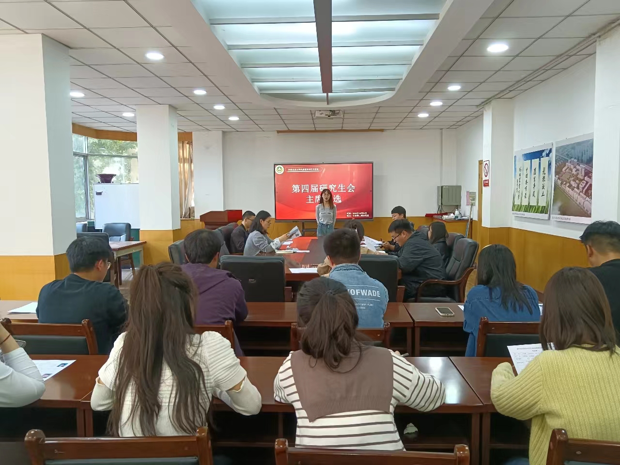 大会开始由主持人陈鹏介绍了此次竞选的候选人、活动流程及竞选规则。本次换届竞选主要分为两个环节。首先为三分钟的自由演讲,包括自我介绍、阐述个人竞选的优势和劣势,对研会所做的贡献,以及对未来研究生会工作的构想与展望。随后为各评委老师根据竞选者的演讲,进行针对性的提问。刘其梅老师就该如何主持风景园林教育大会以及如何平衡好科研任务和研会工作的开展进行提问;陈鹏老师对候选人自身工作进行肯定,并针对研究生会管理工作提出问题。面对评委们的提问,两位候选人从多个方面对问题做出了详细阐述。最后评委本着公平、公正的原则,根据竞选者的综合表现投票。