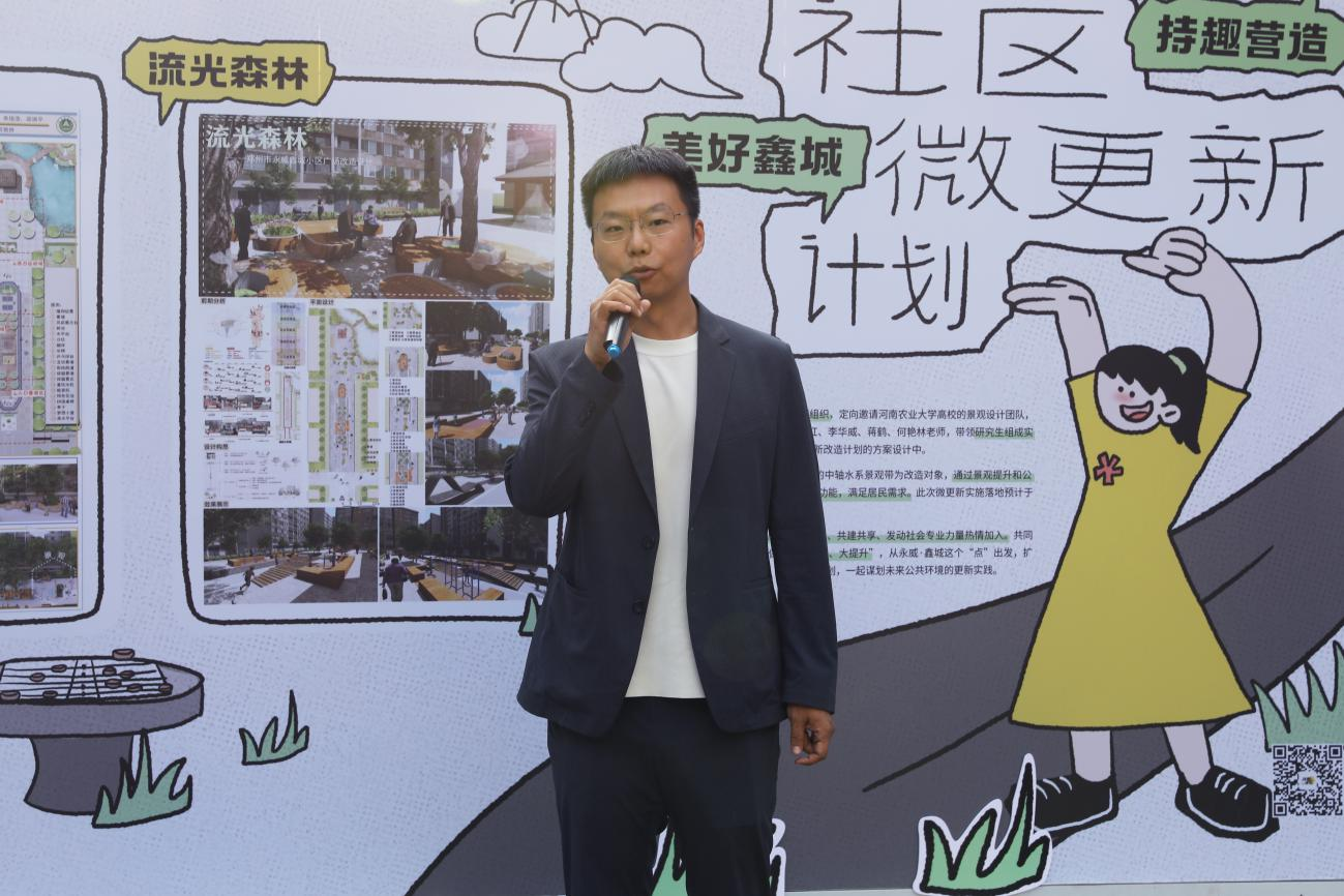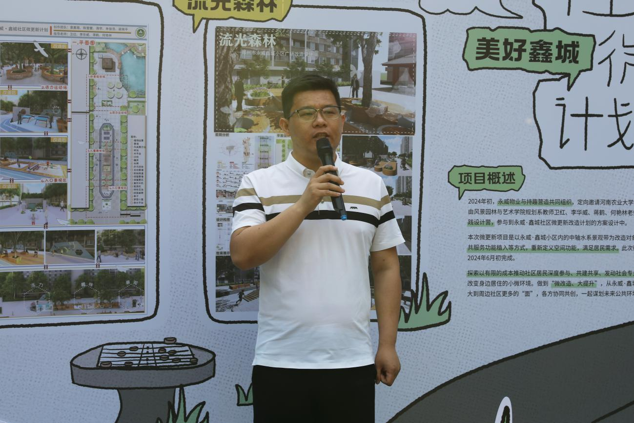4月17日下午,院党委副书记赵九阳、汝河路街道永威社区书记王鹏辉、院规划系教师何艳林、持趣营造团队负责人李沂霖及永威鑫城物业项目经理马永威,参加由永威物业与持趣营造共同组织的永威·鑫城社区微更新改造计划投票活动启动仪式。活动由持趣营造团队成员张希主持。