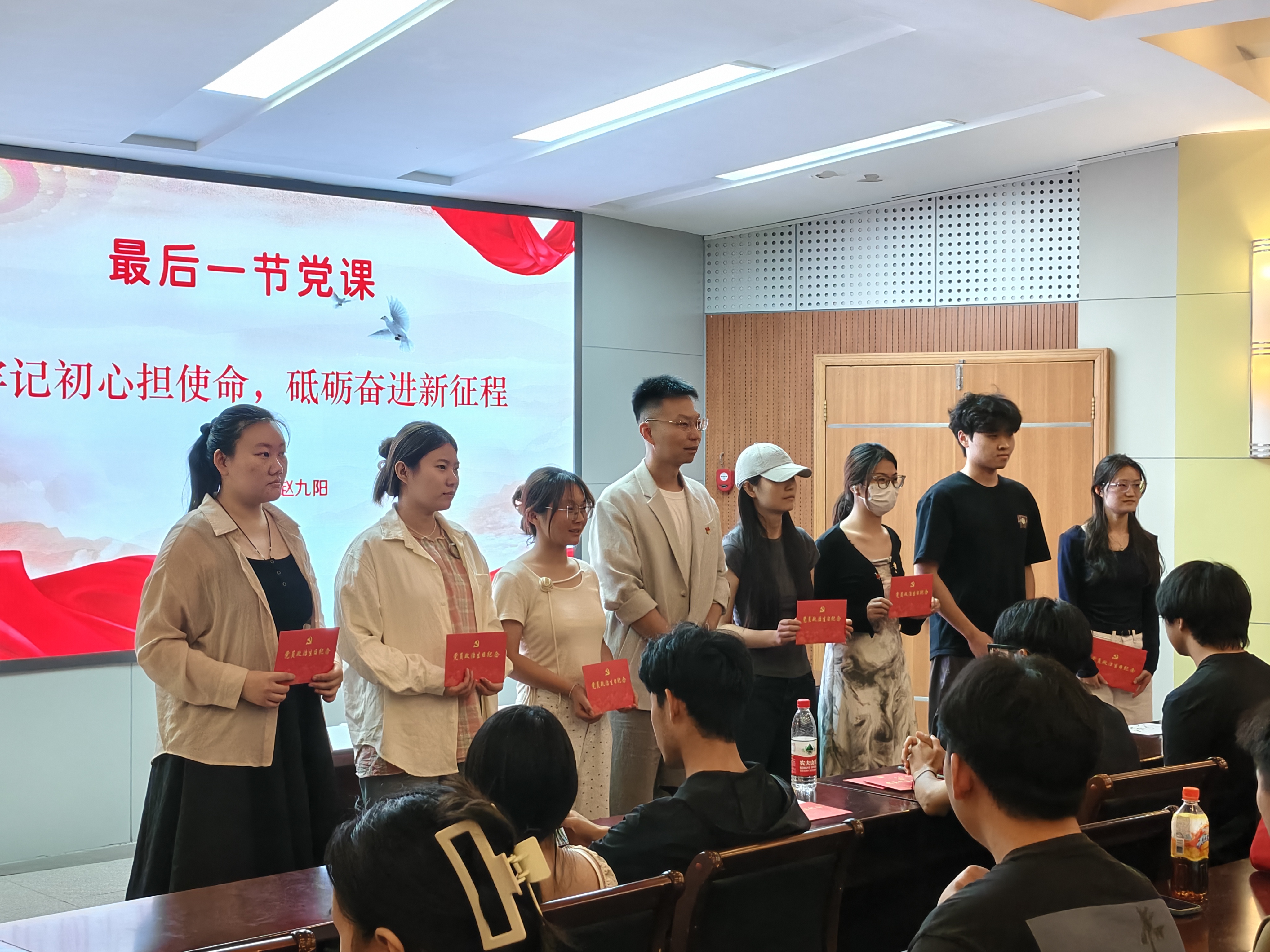 赵九阳以“牢记初心担使命,砥砺奋进新征程”为主题,围绕习近平新时代中国特色社会主义思想的核心要义,紧密结合新时代党和国家事业发展要求,系统阐述毕业生党员应当具备的政治品格与使命担当。指出,作为即将踏入社会的毕业生党员,一是要继续加强学习,不断提升自己的综合素质和能力。不断更新知识结构和技能水平,以适应时代的发展和社会的需求;二是要勇于担当作为,积极投身实践和社会服务,用实际行动践行党的宗旨和理念。随后,赵九阳为毕业生党员代表颁发“政治生日卡”,激励大家铭记政治身份,坚定理想信念。