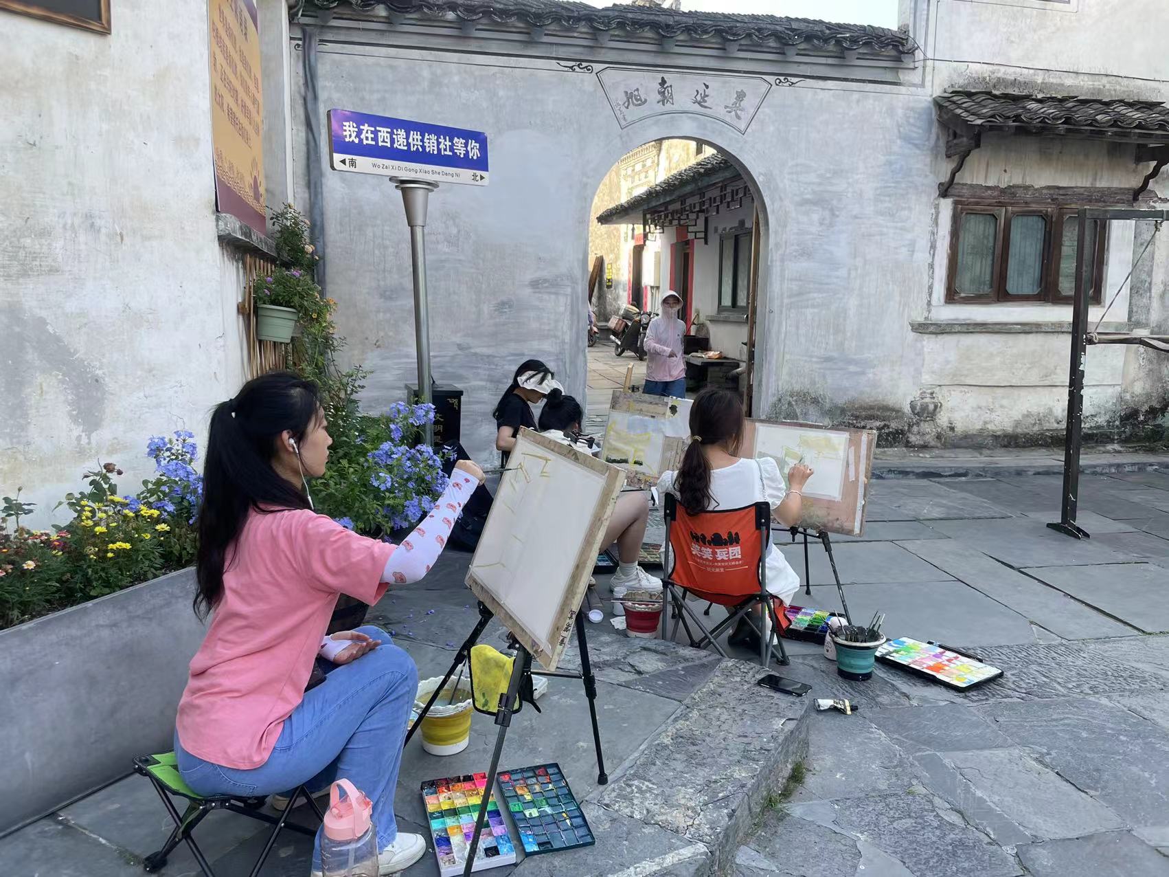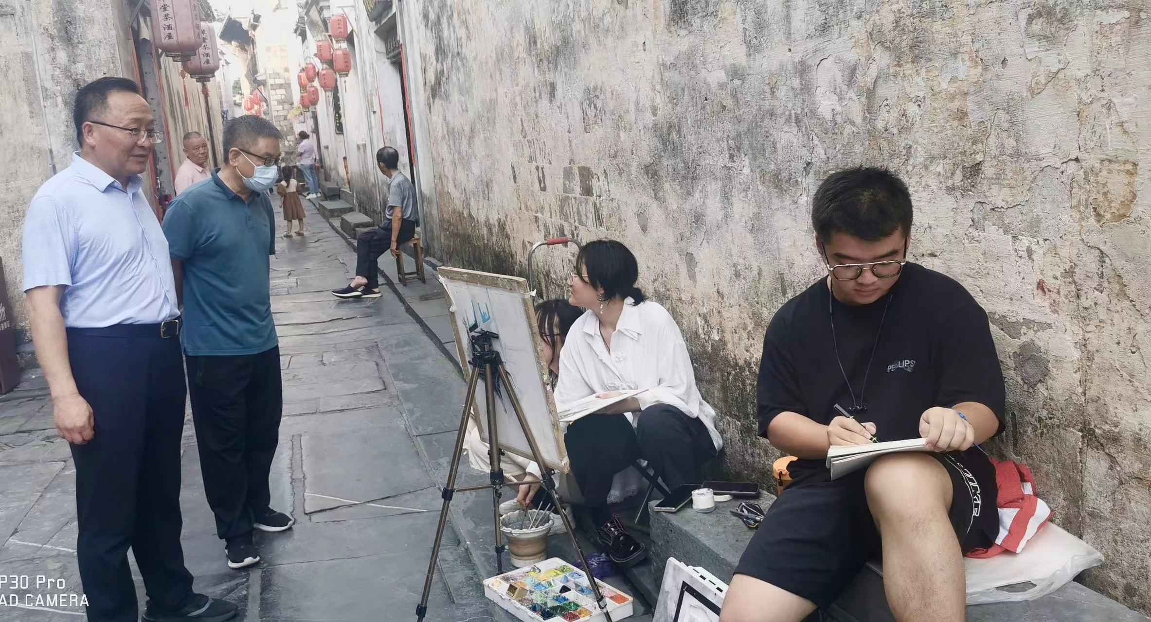 参加写生实习的师生热烈欢迎院领导的到来。初到基地,侯永华向一线老师和同学们表达了诚挚的问候,关心询问大家的身体健康状况和实习课程开展情况,并感谢教师们在实习期间坚守岗位辛勤付出。随后,侯永华一行在孟滨的带领下走访考察写生实习基地和西递古村落。